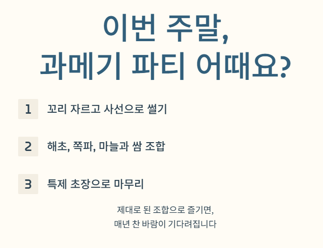 - 해초, 쪽파, 마늘과의 쌈 조합을 절대 잊지 마세요.