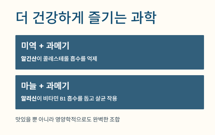 과메기는 고단백 식품이지만 지방 함량이 높습니다. 이때 **'미역'**과 **'마늘'**을 곁들이는 것은 과학적인 이유가 있습니다.