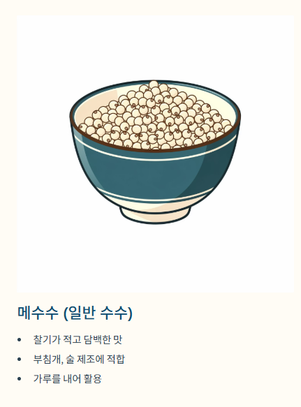 | 메수수(일반 수수) | 찰기가 적고 담백함 | 가루를 내어 부침개나 술을 만들 때 |