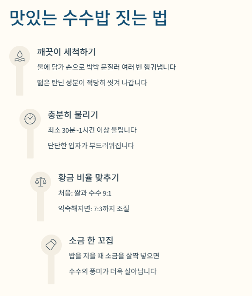 - 소금 한 꼬집: 밥을 지을 때 소금을 아주 살짝 넣으면 수수의 풍미가 더욱 살아납니다.