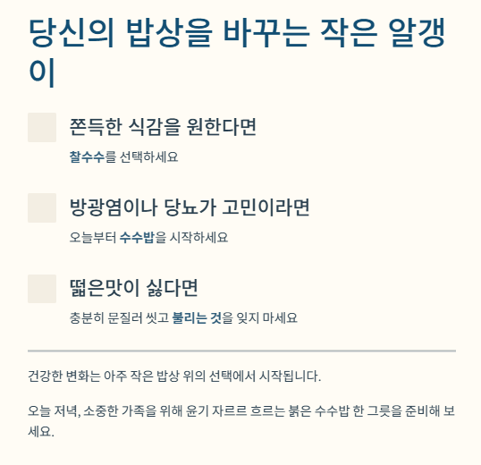 오늘 저녁, 소중한 가족을 위해 윤기가 자르르 흐르는 붉은 수수밥 한 그릇을 준비해 보시는 건 어떨까요? 건강한 변화는 아주 작은 밥상 위의 선택에서 시작됩니다.