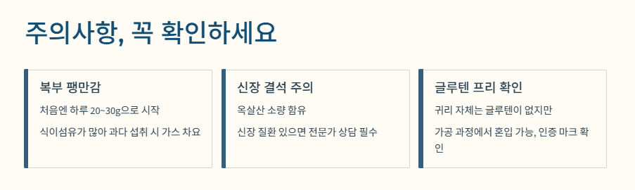 - 신장 결석 주의: 귀리에는 소량의 '옥살산(Oxalate)'이 들어있습니다. 신장 결석이 있는 분들은 과도한 섭취를 피하고 전문가와 상담하세요.