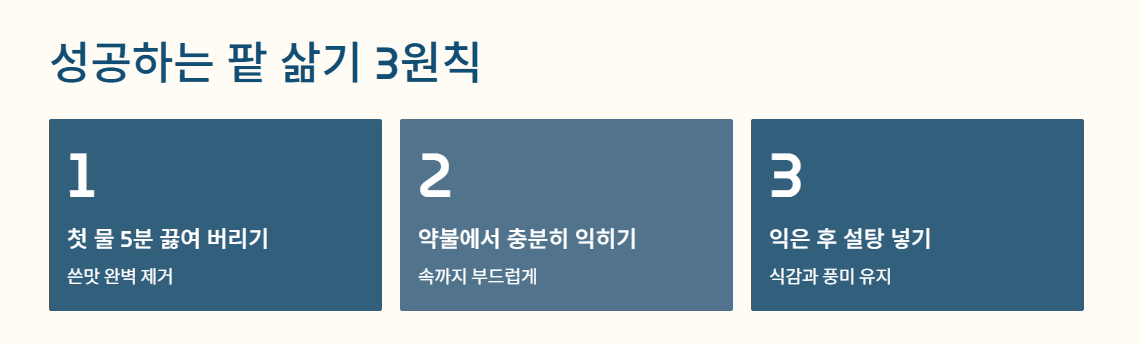팥 삶는 방법은 의외로 간단하지만, 그 안에 담긴 '첫 물 버리기'와 '익힘 정도 확인'이라는 디테일이 맛의 차이를 만듭니다.