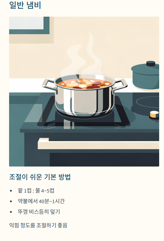 | 팥밥 | 약 20~30분 | 알갱이가 터지지 않고 살짝 씹히는 정도 (쌀과 함께 다시 익히기 때문) |