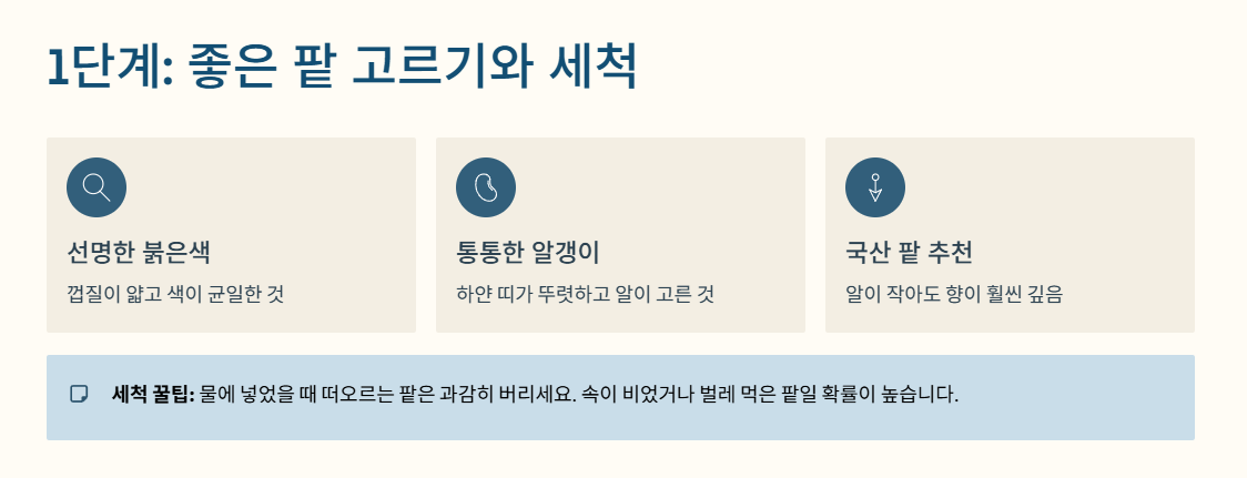 지금부터 팥 선택부터 전처리, 본 삶기, 보관법까지 단계별로 상세히 알아보겠습니다.