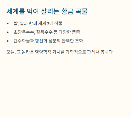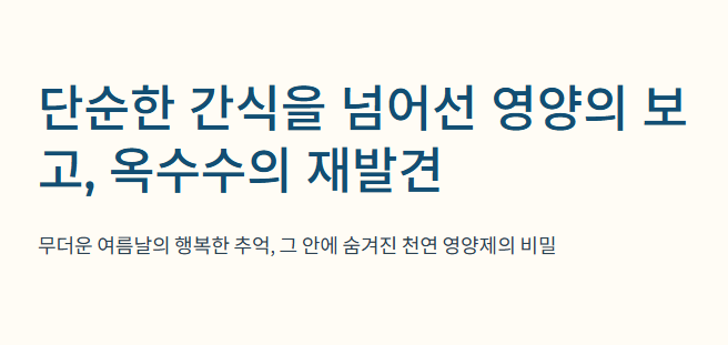 작은 알갱이 하나에 담긴 생명력을 온전히 누려보시길 바랍니다. 오늘 저녁 가족들과 함께 갓 쪄낸 고소한 옥수수 파티를 열어보는 건 어떨까요?
