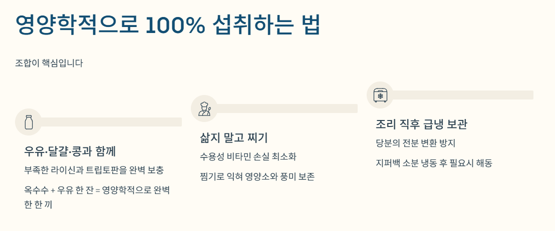 - 우유, 달걀, 콩과 함께 섭취: 옥수수에 부족한 아미노산을 우유나 달걀이 완벽하게 보충해 줍니다. 옥수수를 먹을 때 우유 한 잔을 곁들이면 영양학적으로 완벽한 한 끼가 됩니다.