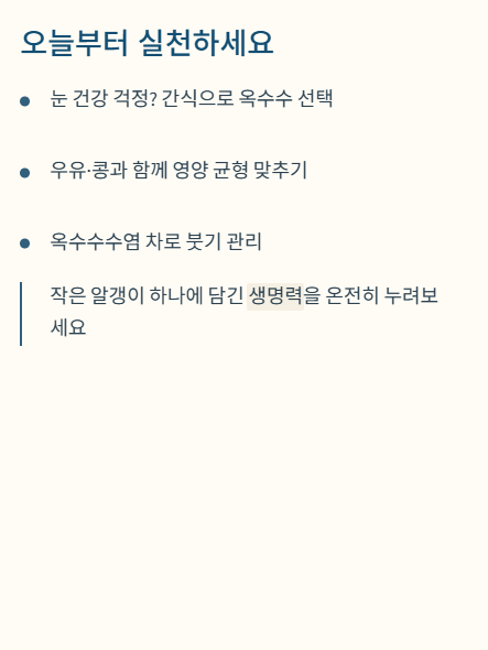 - 원푸드 다이어트 금지: 옥수수만으로 식사를 대신하면 비타민 B3 결핍으로 인한 '펠라그라(피부염, 설사 등)' 증상이 나타날 수 있습니다. 반드시 단백질 식품과 채소를 병행하세요.