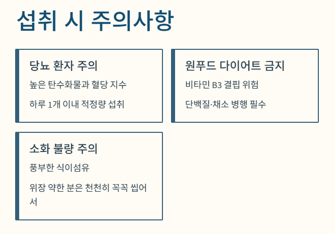 - 소화 불량: 식이섬유가 많아 평소 위장이 약한 분이 과다 섭취하면 복부 팽만감이나 가스가 찰 수 있으니 천천히 꼭꼭 씹어 드셔야 합니다.