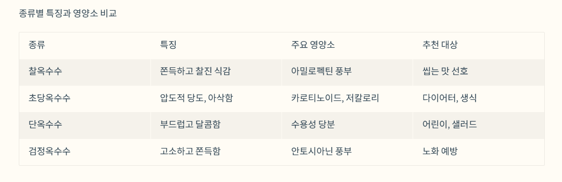 | 검정/얼룩옥수수 | 고소하고 쫀득함 | 안토시아닌(항산화) 풍부 | 노화 예방에 신경 쓰는 분 |