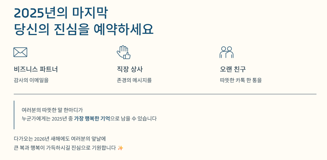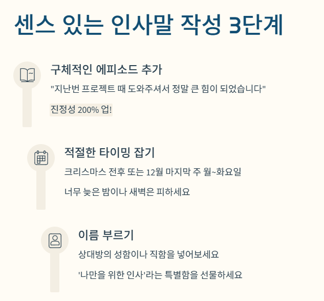 - 적절한 타이밍 잡기: 크리스마스 전후나 12월 마지막 주 월요일~화요일 정도가 인사를 전하기 가장 좋은 골든타임입니다. 너무 늦은 밤이나 새벽은 피하세요.