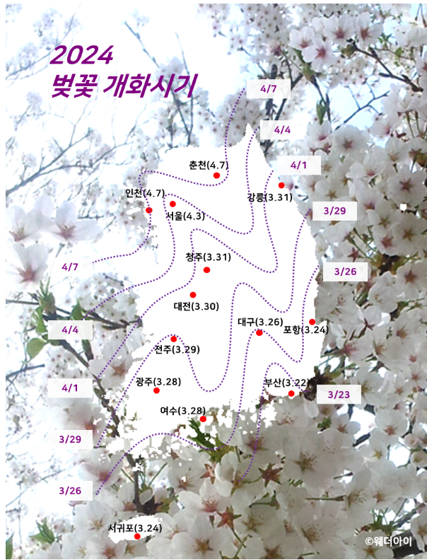 - 2024년 봄꽃 개화 시기는 전체적으로 평년보다 1~7일 정도 빠를 것으로 예상하고 있습니다.