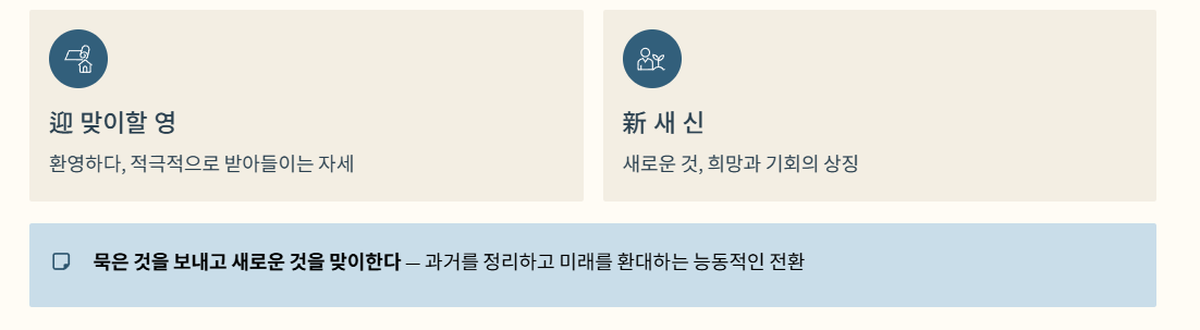 따라서 이를 직역하면 **"묵은 것을 보내고 새로운 것을 맞이한다"**는 뜻이 됩니다. 이는 단순히 시간의 흐름을 받아들이는 수동적인 태도가 아니라, 과거를 정리하고 미래를 환대하는 능동적인 전환을 의미합니다.