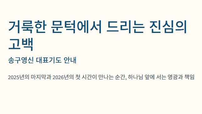 "2025년의 마지막 시간과 2026년의 첫 시간이 교차하는 순간, 전 성도를 대표하여 하나님 앞에 서는 '대표기도자'의 자리는 큰 영광인 동시에 무거운 책임감이 느껴지는 자리입니다. 어떤 말로 지난 한 해의 감사를 표현해야 할지, 또 어떤 간구로 새해의 문을 열어야 할지 고민하고 계신가요? 기교 섞인 화려한 문장보다 중요한 것은 공동체의 마음을 하나로 묶어 보좌 앞으로 인도하는 '진심'입니다."