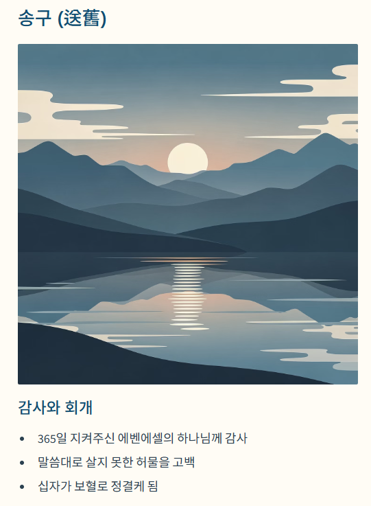 - 송구(감사와 회개): 365일 동안 지켜주신 에벤에셀의 하나님께 감사하며, 말씀대로 살지 못했던 우리의 허물을 고백하는 단계입니다.