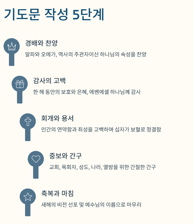- 교회 표어 반영: 새해에 발표될 교회의 표어나 주제 성구를 기도문 중간에 녹여내면 성도들의 공감을 얻기 좋습니다.