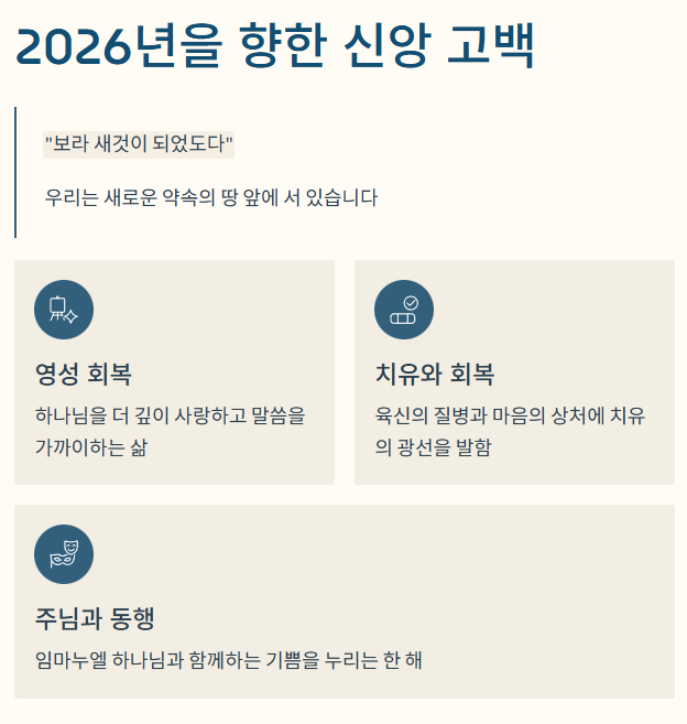 이제 우리는 2026년이라는 새로운 약속의 땅 앞에 서 있습니다. "보라 새것이 되었도다" 선포하신 주님의 말씀을 믿고 나아갑니다. 우리 성도들의 가정마다 하나님의 평강이 임하게 하시고, 일터와 사업장 위에 복의 근원이 되어 주시옵소서. 자녀들이 믿음의 세대로 굳건히 세워지게 하시고, 육신의 질병과 마음의 상처로 고통받는 자들에게 치유의 광선을 발하여 주시옵소서. 올 한 해, 무엇보다 하나님을 더 깊이 사랑하고 말씀을 가까이하며, 주님과 동행하는 기쁨을 누리는 삶이 되게 하옵소서.