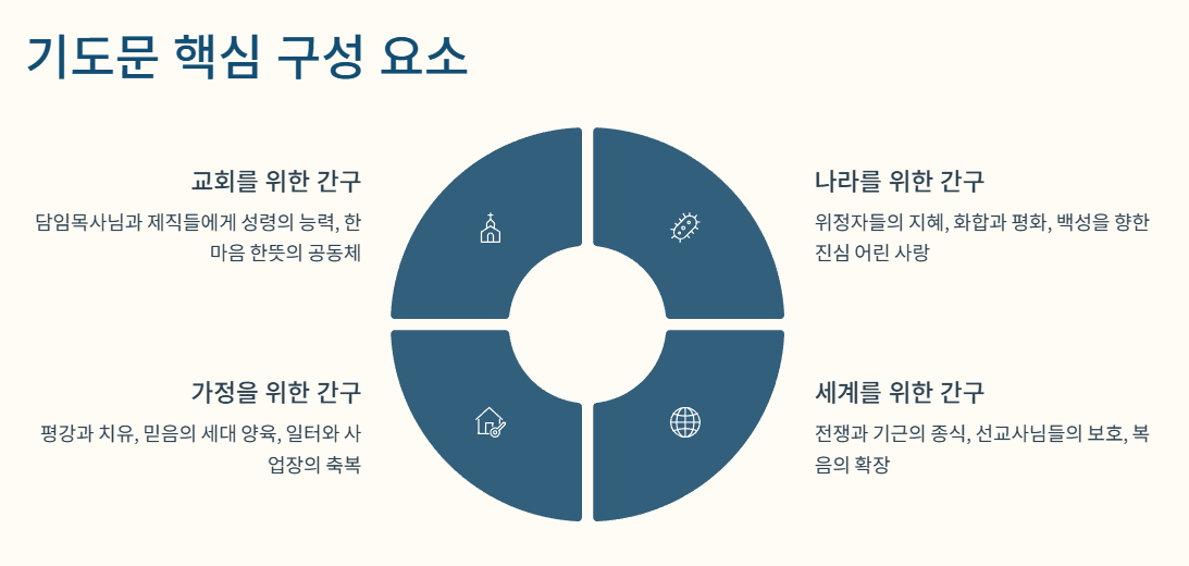 | 4. 중보 및 간구 | 교회, 목회자, 성도, 나라, 열방을 위한 간구 | 영성 회복, 치유, 나라의 평안 |