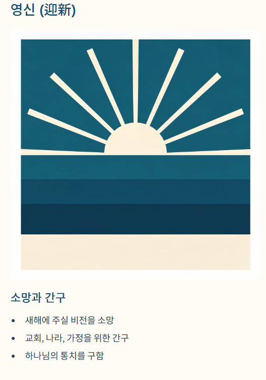 - 영신(소망과 간구): 새해에 주실 비전을 소망하며 교회, 나라, 가정을 위해 하나님의 통치를 구하는 단계입니다.