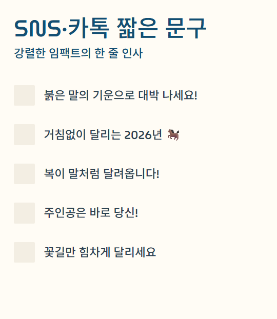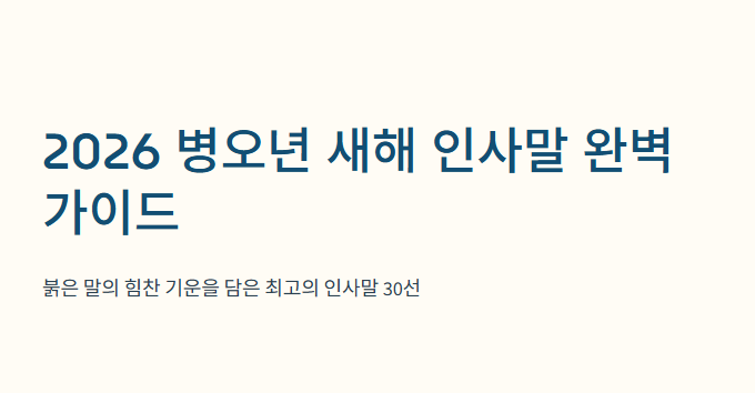 "매년 돌아오는 새해지만, 2026년은 조금 더 특별합니다. 바로 역동적이고 열정적인 기운이 가득한 '붉은 말의 해', 병오년(丙午年)이기 때문입니다. '다사다난했던...'으로 시작하는 뻔한 인사말 대신, 상대방의 성공을 진심으로 응원하고 말의 힘찬 기상처럼 도약하라는 에너지를 전해보는 건 어떨까요? 잘 선택한 문구 하나가 여러분의 인맥을 더욱 탄탄하게 하고, 받는 이의 하루를 설렘으로 가득 채울 수 있습니다."
