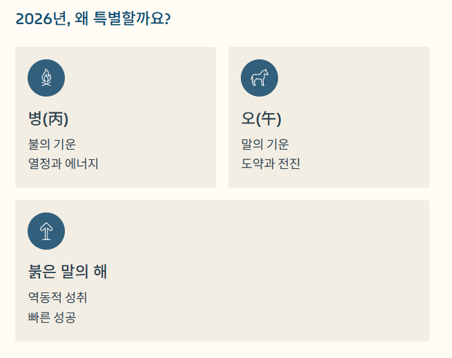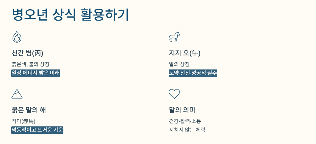 | 병오년 의미 | '붉은 말의 해' (적마, 赤馬) | "역동적이고 뜨거운 기운"이라는 표현 활용 |