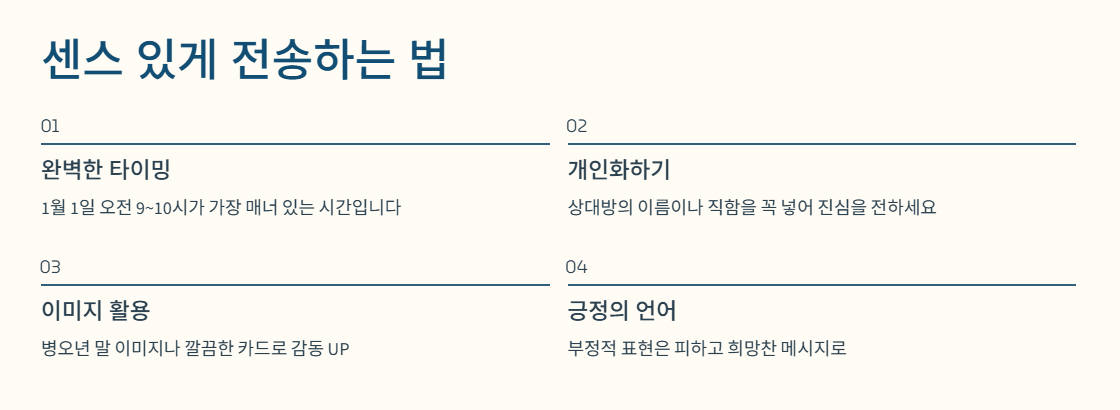 - 타이밍이 생명: 1월 1일 자정에 맞춰 보내는 것도 좋지만, 너무 늦은 시간이라면 1월 1일 오전 9~10시경에 보내는 것이 가장 매너 있는 타이밍입니다.