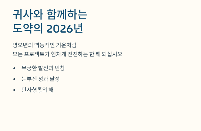 - 적절한 이미지 활용: 병오년에 맞는 말 이미지나 깔끔한 신년 카드를 곁들이면 가독성과 감동이 배가 됩니다.