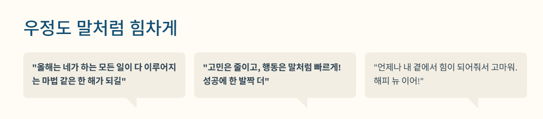- 부정적 단어 피하기: "작년에 힘들었지만" 같은 말보다는 "올해는 더 찬란할"이라는 긍정적인 방향의 문장을 선택하세요.