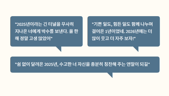 - 2025년 한 해 동안 네가 보여준 밝은 에너지 덕분에 나도 힘을 낼 수 있었어. 내년에도 우리 파이팅하자!