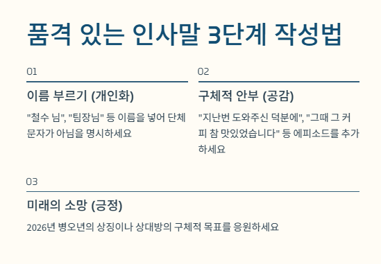 | 2단계: 구체적 안부 | 공감(Empathy) | "지난번 도와주신 덕분에", "그때 그 커피 참 맛있었습니다" 등 에피소드 추가 |