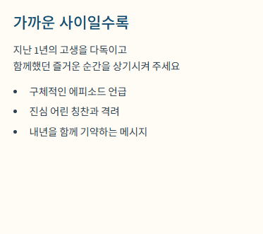 가까운 사이일수록 지난 1년간의 고생을 다독이고, 함께했던 즐거운 순간을 상기시키는 것이 좋습니다.