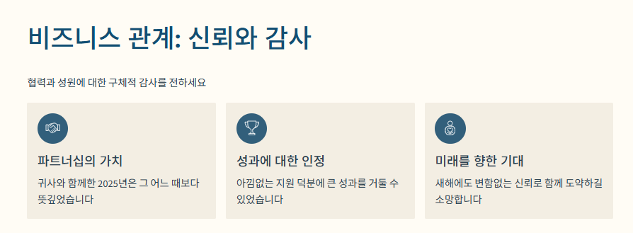 비즈니스 관계에서는 한 해 동안의 협력에 대한 구체적인 감사와 예우를 갖추는 것이 핵심입니다.