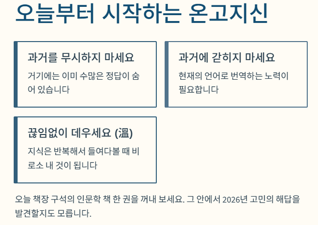 즉, 온고지신을 직역하면 **"옛것을 익히고 그것을 미루어서 새것을 안다"**는 뜻입니다. 여기서 핵심은 '온(溫)'입니다. 단순히 책을 읽는 것이 아니라, 마치 식은 국을 정성스레 데우듯 과거의 지혜를 현대적 감각으로 다시 따뜻하게 소생시켜야 한다는 철학이 담겨 있습니다.