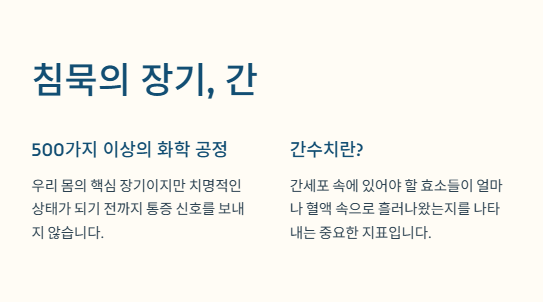 "지독한 피로감이 가시지 않나요? 혹은 건강검진 결과지에 적힌 빨간색 숫자들을 보고 당황하셨나요? 간은 우리 몸에서 500가지 이상의 화학 공정을 담당하는 핵심 장기이지만, '침묵의 장기'라는 별명처럼 치명적인 상태가 되기 전까지는 특별한 통증 신호를 보내지 않습니다.