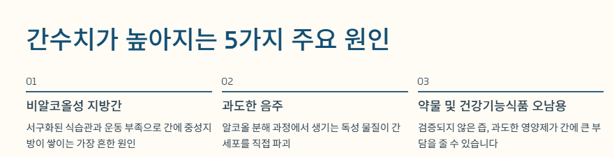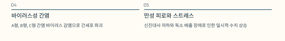- 만성 피로와 스트레스: 신진대사가 저하되고 독소 배출이 원활하지 않으면 간수치가 일시적으로 상승할 수 있습니다.