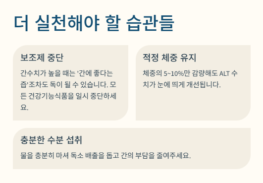 - 확인되지 않은 보조제 중단: 간수치가 높을 때는 '간에 좋다는 즙'조차도 간에는 독이 될 수 있습니다. 모든 건강기능식품을 일시 중단하고 물을 충분히 마시세요.