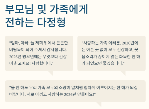 - "사랑하는 가족 여러분, 2026년에는 아픈 곳 없이 모두 건강하고, 웃음소리가 끊이지 않는 화목한 한 해가 되었으면 좋겠습니다. 새해 복 많이 받으세요!"