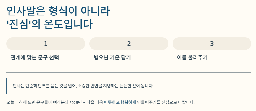 인사는 단순히 안부를 묻는 것을 넘어, 소중한 인연을 지탱하는 든든한 끈이 됩니다. 오늘 추천해 드린 문구들이 여러분의 2026년 시작을 더욱 따뜻하고 행복하게 만들어주기를 진심으로 바랍니다.