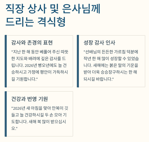 - "팀장님, 지난 한 해 동안 베풀어 주신 따뜻한 지도와 배려에 깊은 감사를 드립니다. 2026년 병오년에도 늘 건승하시고 가정에 평안이 가득하시길 기원합니다."