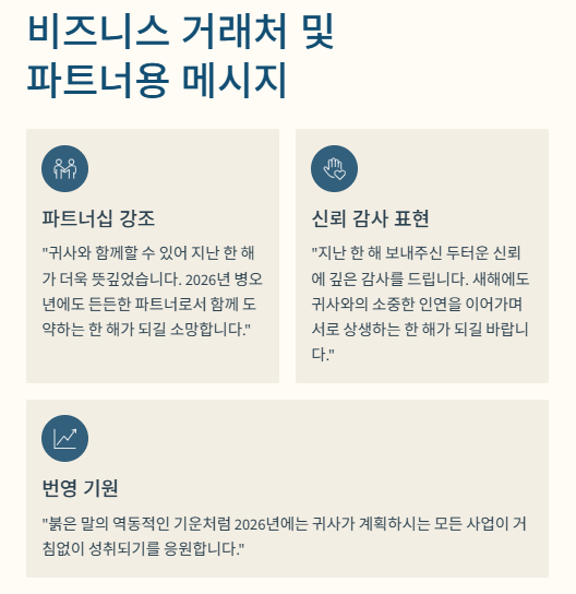 - "귀사의 무궁한 발전을 기원합니다. 붉은 말의 역동적인 기운처럼 2026년에는 귀사가 계획하시는 모든 사업이 거침없이 성취되기를 응원합니다."
