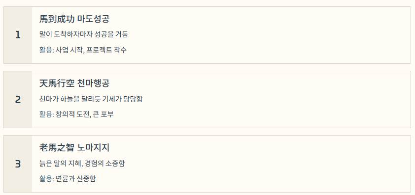 | 마도성공 | 馬到成功 | 말이 도착하자마자 성공을 거둠 | 사업 시작이나 프로젝트 착수 시 |