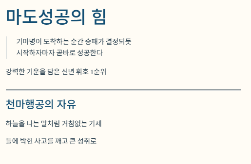| 천마행공 | 天馬行空 | 천마가 하늘을 달리듯 기세가 당당함 | 창의적인 일이나 큰 포부를 밝힐 때 |