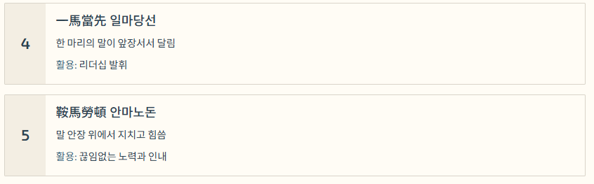 | 일마당선 | 一馬當先 | 한 마리의 말이 앞장서서 달림 | 리더십을 발휘해야 하는 상황에서 |