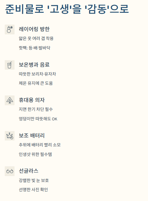 - 방한 대책 (레이어링): 두꺼운 패딩 하나보다 얇은 옷을 여러 겹 껴입는 것이 체온 유지에 유리합니다. 핫팩은 등, 배, 발바닥에 부착하는 것이 효율적입니다.