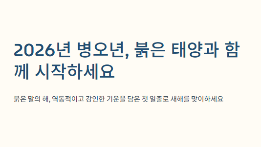 새해 첫 태양은 모두에게 공평하게 떠오르지만, 그 태양을 맞이하는 마음가짐은 저마다 다를 것입니다. 2026년 병오년, 붉은 말의 정열적인 기운을 받아 여러분이 소망하는 모든 일이 성취되는 한 해가 되기를 진심으로 기원합니다.