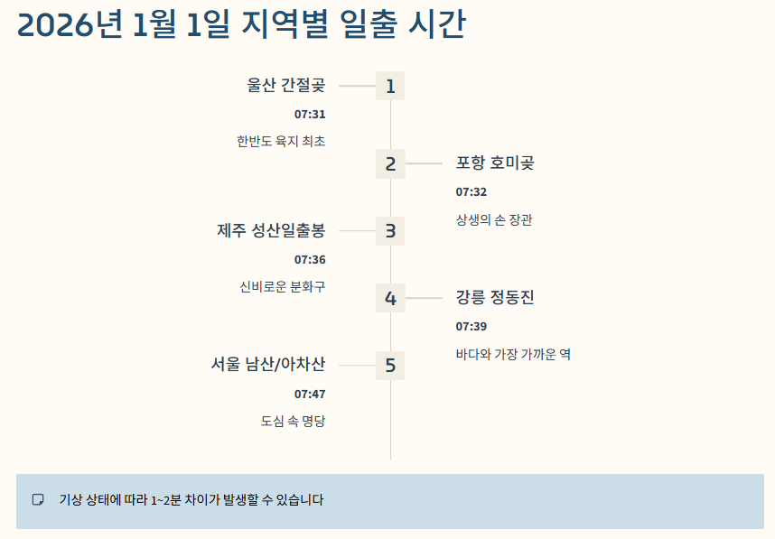 [2026년 1월 1일 주요 지역 예상 일출 시간표]