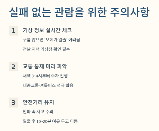 - 안전거리 유지: 인파가 몰리는 순간 사고가 발생하기 쉽습니다. 일출 직후 우르르 나가는 인파를 피해 10~20분 정도 여유를 두고 이동하는 것을 권장합니다.