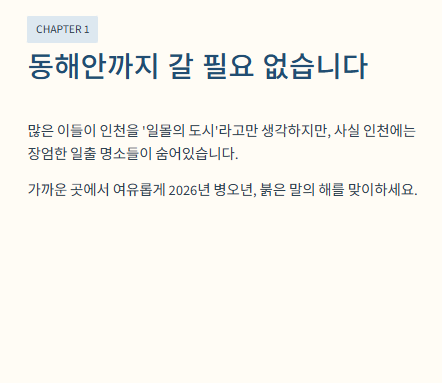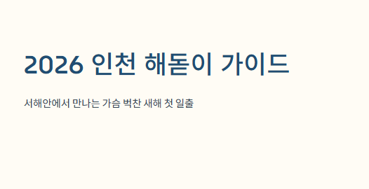 특히 2026년 병오년(丙午年), 붉은 말의 해를 맞이하는 첫 아침을 가까운 곳에서 여유롭게 시작하고 싶은 분들을 위해 준비했습니다. 영종도의 신비로운 섬 일출부터 도심 한복판에서 즐기는 산 정상 해돋이까지, 인천이 선사하는 특별한 새해의 순간을 지금 공개합니다."