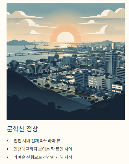 - 포인트: 인천 시내 전체가 붉게 물드는 광경과 함께 저 멀리 인천대교까지 보이는 파노라마 뷰가 특징입니다.