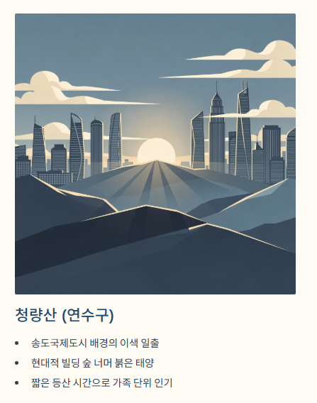 송도국제도시와 가까운 청량산은 높지 않으면서도 조망이 훌륭합니다. 현대적인 고층 빌딩 숲 너머로 붉은 태양이 떠오르는 '어반 일출(Urban Sunrise)'을 감상할 수 있습니다.